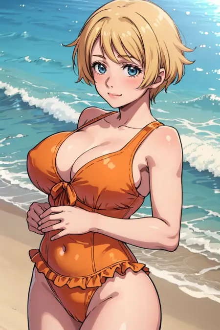 Ukraine from Hetalia, hopefully this LoRA will be able to show her kind heart and large melons. Some checkpoints think, she would look better with a hair-bun then showing her from side or back, so "short hair" is on the more mandatory side, also then using "dress" prompt, she does like having her necktie, so reducing LoRA weight to 0.8 (or even 0.7 on some checkpoints) could be unavoidable.