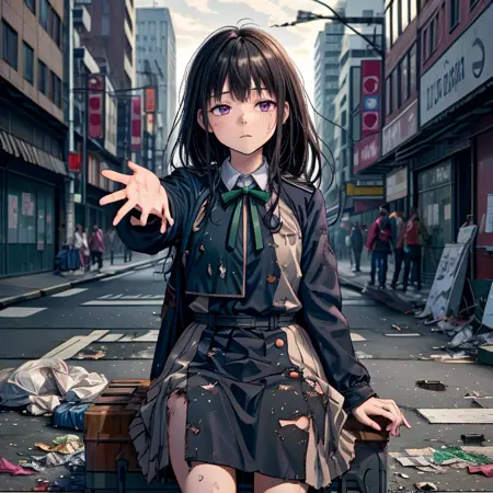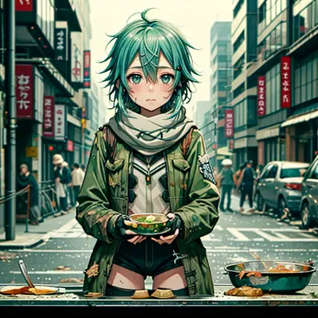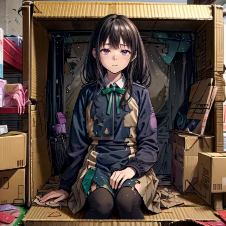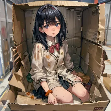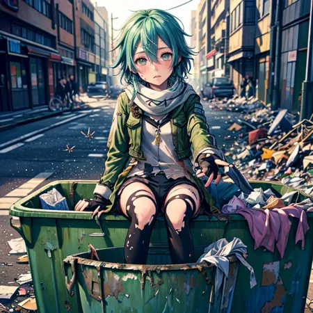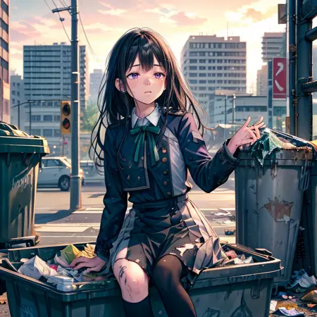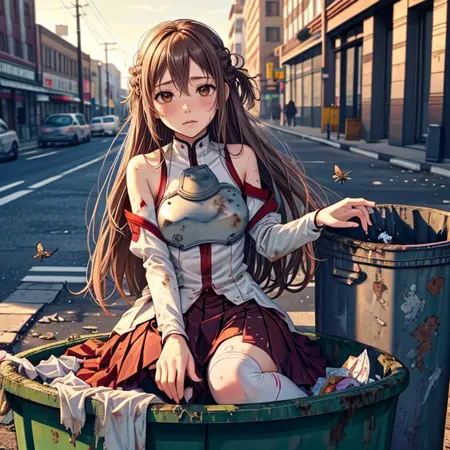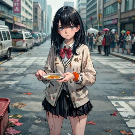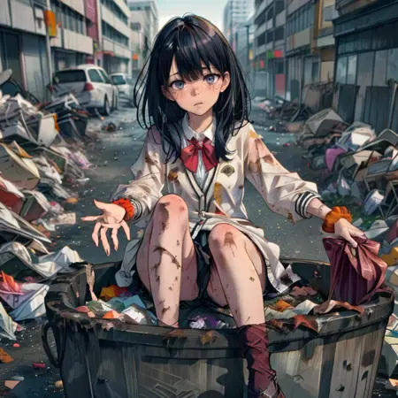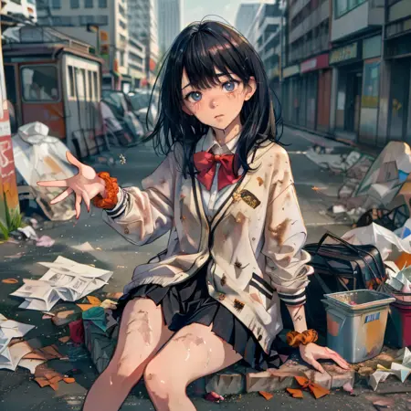 I have created Lora, a character designed to recreate scenes where the heroine, a beloved character, is defeated by an enemy and left in a disheveled state, reflecting a common element in hero-pin stories. The scenes I've focused on include her receiving food at a soup kitchen, living in a cardboard box home, begging for alms, and rummaging through trash cans. Although I have used about 25 different assets for the soup kitchen scene, where she's supposed to be at the front of the line receiving soup in a dirty dish, it doesn't seem to work properly. Similarly, for the scene where she's rummaging through trash cans, despite being trained on the relevant materials, she only appears to be standing next to the trash can. I'm hoping someone can provide a better prompt to effectively address these issues.