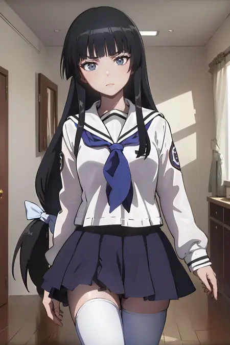 UmeShiraume, low-tied long hair, white ribbon, serafuku, blue necktie, blue skirt, white thighhighs