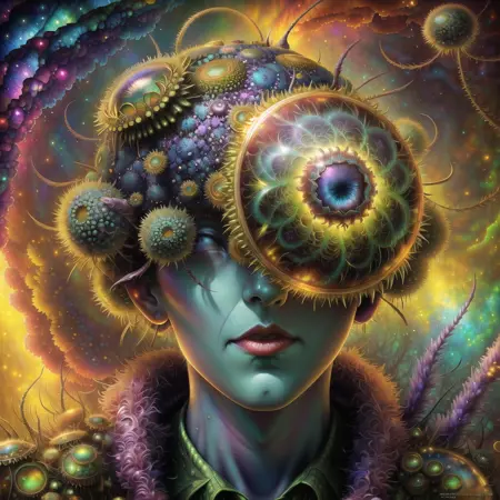 결과물에 재미있는 패션 아이템을 입은 남자가 나타날 수 있습니다. 그는 훈련 이미지의 일부입니다. "사람, 인물, 자켓, 정장"과 같은 부정적 프롬프트로 유령처럼 쫓아내려 시도할 수 있지만, 저는 그를 그대로 두고 인페인팅으로 더 외계적인 존재로 만들기를 선호합니다.