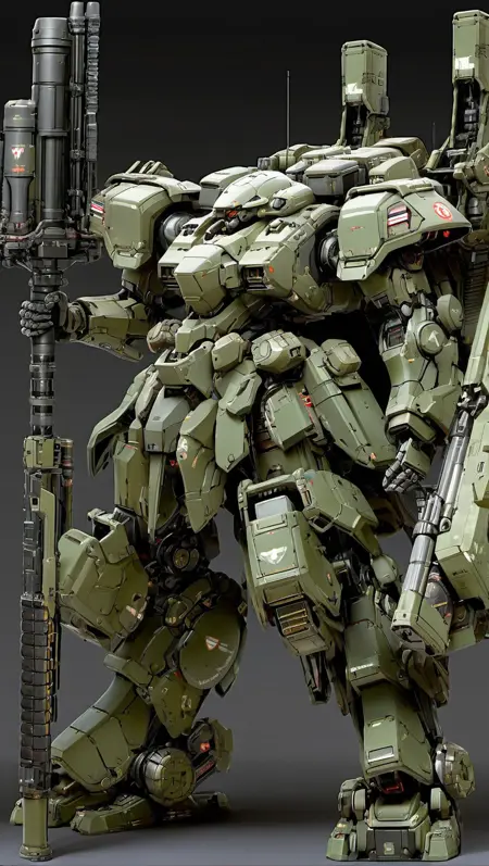 (MECHA-BACK-UNIT:2),(RRS:1.2),best quality, masterpiece, ultra-detailed, mecha robot,(dynamic pose:2),(ultra-detailed mecha armor), full armor, (very large size mecha:1.5), glowing eyes, (full body:1.2), (mechanical parts:1), (robot joints:1), (military parts:1), (heroic parts:1)(Detailed eye description:1.2),(huge mechanical weapon:1.2), (detailed weapon description:1.2), (holding weapon and weapon :1.5)