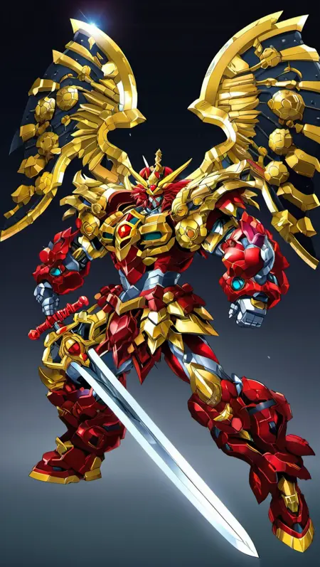 (RRS:1),(MECHA-WINGS:2),best quality, masterpiece, ultra-detailed, mecha robot,(dynamic pose:2),(ultra-detailed mecha armor), full armor, (very large size mecha:1.5), glowing eyes, (full body:1.2), (mechanical parts:1), (robot joints:1), (military parts:1), (heroic parts:1),(Detailed eye description:1.2),(huge mechanical weapon:1.2), (detailed weapon description:1.2), (holding weapon and weapon :1.5)