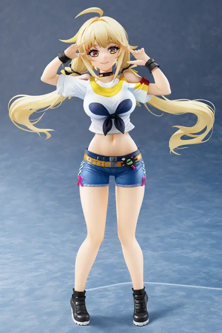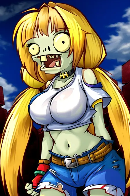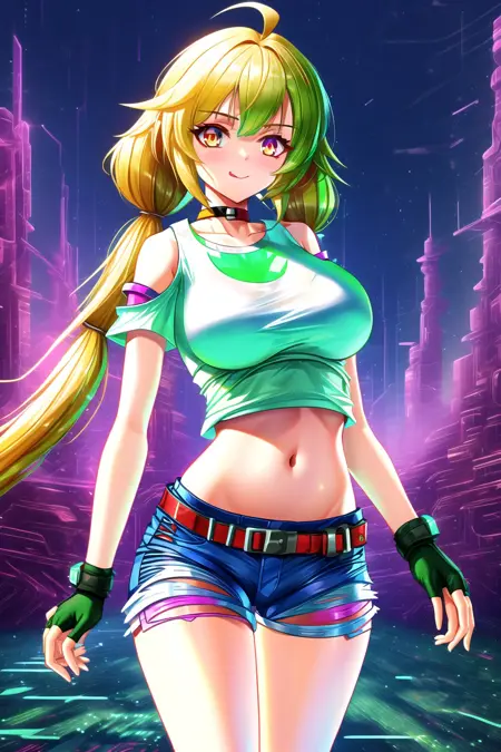 Additional Tags: very long hair, low twintails, exposed pocket, white shirt, arm warmers, denim, blue shorts, short shorts, undershirt, fingerless gloves, navel, thighs, large breasts