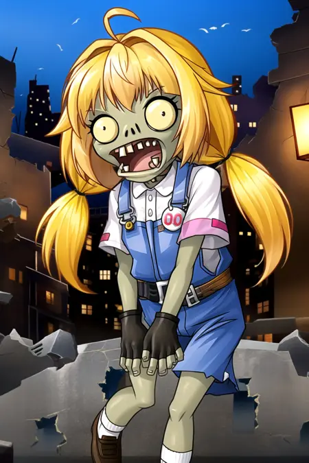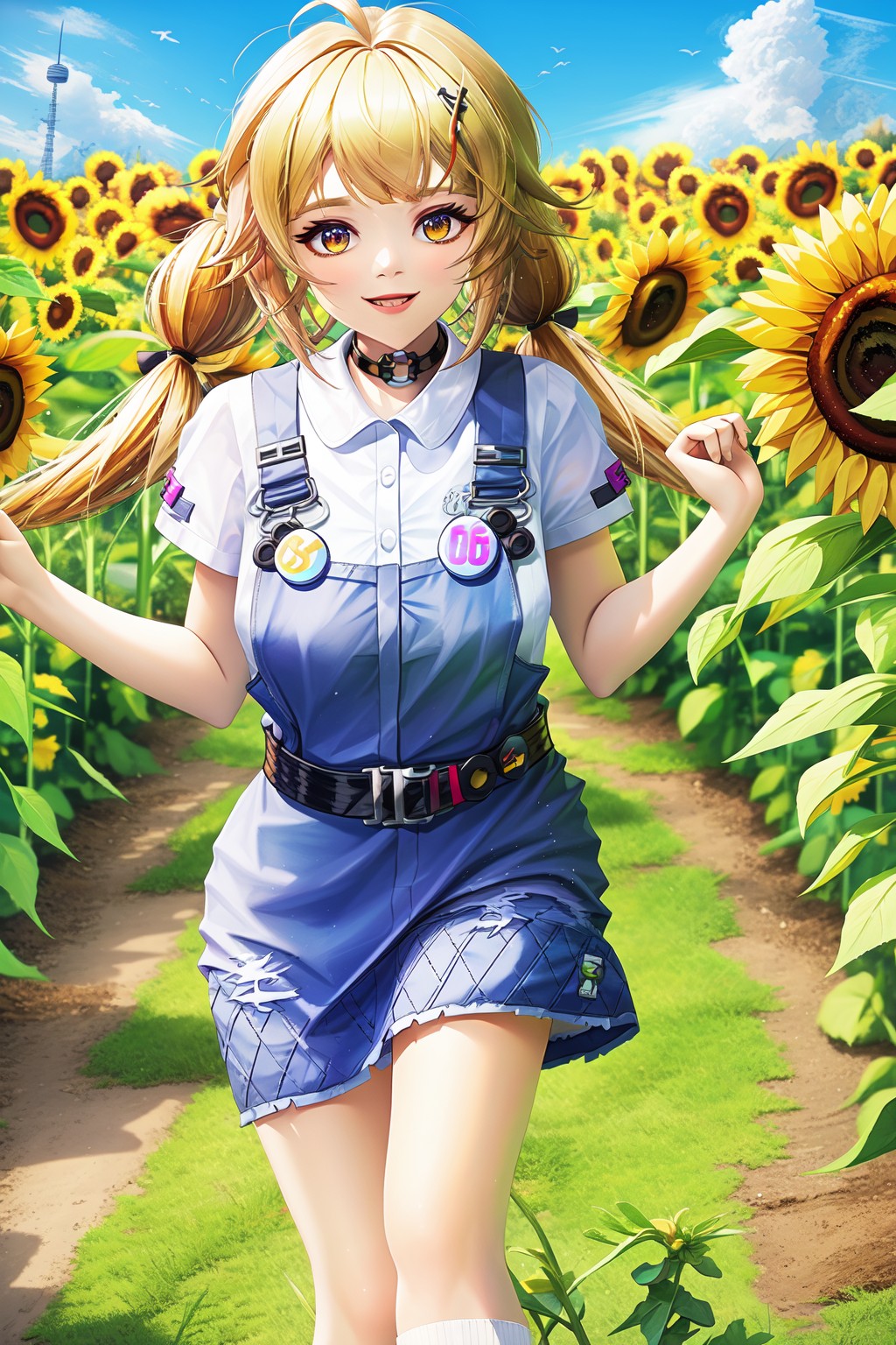 Face: yellow eyes, blonde hair, ahoge, long hair, twintails, choker,