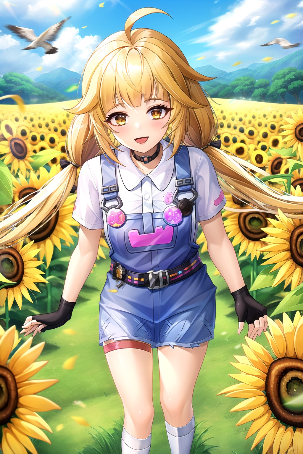 Additional tags: low twintails, black choker, cat choker, overall skirt, collared shirt, short sleeves, black gloves, fingerless gloves, white socks, bandaid, bandaid on leg, black footwear,
