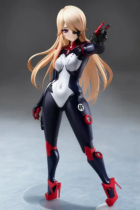 Face: red eyes, ahoge, blonde hair, long hair, eyepatch,