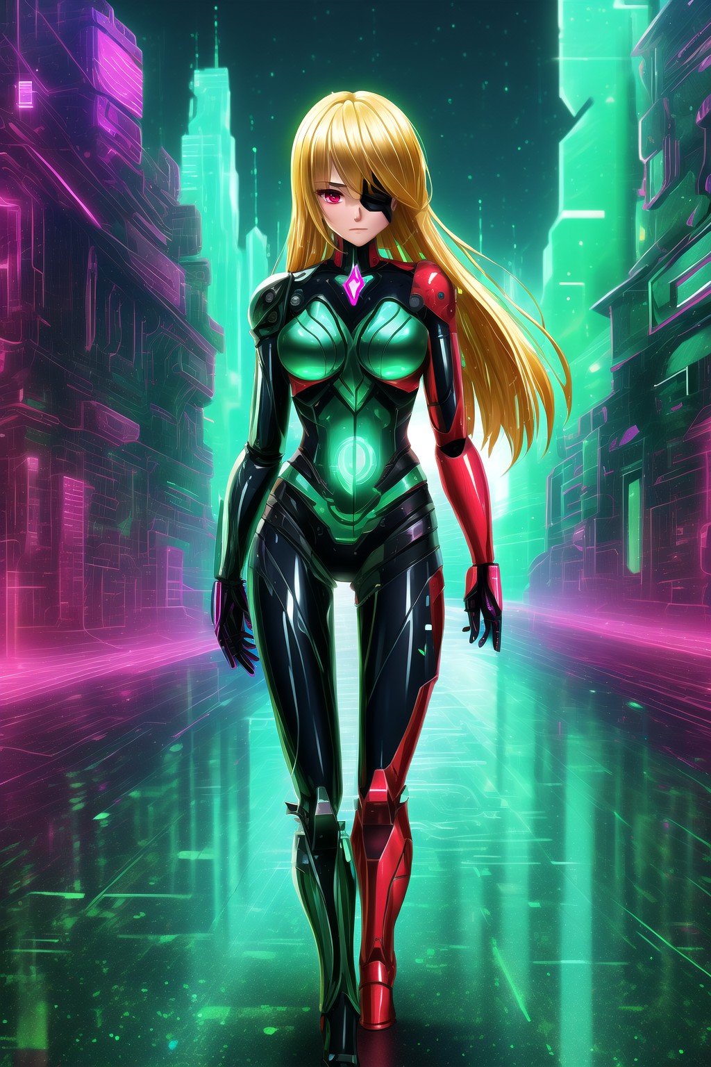 Additional tags: cyborg, mechanical arms, mechanical legs, very long hair, hair over one eye, one eye covered, high heels,