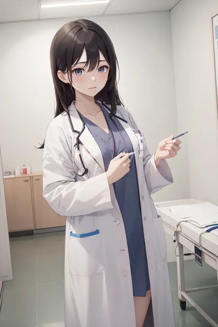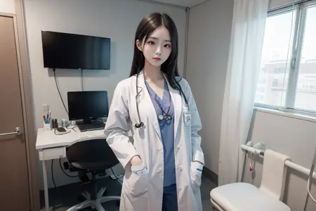 이것은 제가 훈련한 또 다른 의학 주제 LoRA입니다. 이 모델은 수술복 위에 의사의 흰 외투를 입은 의사의 모습을 생성합니다. 이것은 오늘날 병원에서 의사들이 입는 매우 흔한 복장입니다. 단순히 외투만 원하신다면 LoRA를 사용할 필요 없이 프롬프트만으로도 충분합니다.