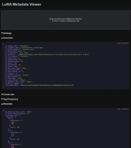 사용법: 첨부된 Zip 파일을 추출한 후, 원하는 웹 브라우저로 추출된 HTML 파일을 열기만 하면 됩니다. 또는 GitHub에 호스팅된 버전을 사용할 수 있습니다: https://xypher7.github.io/lora-metadata-viewer