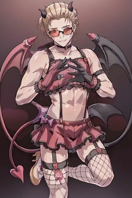 Without trident: armband, bare shoulders, bead bracelet, bead, bow, bracelet, camisole, choker, demon horns, demon tail, demon wings, fake horns, fake tail, fake wings, fishnet thighhighs, fishnets, frilled skirt, frills, garter straps, gloves, hair bow, horns, jewelry, midriff, pink bow, pink camisole, pink gloves, pink skirt, polka dot, polka dot bow, skirt, spaghetti strap, suspender skirt, suspenders, tail, thighhighs, tiara, shoes, high heels,