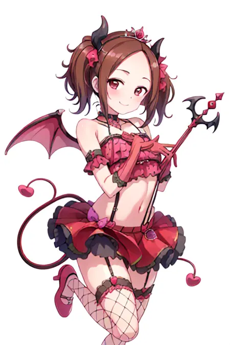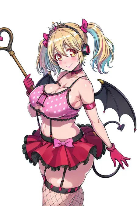 With trident: armband, bare shoulders, bead bracelet, bead, bow, bracelet, camisole, choker, demon horns, demon tail, demon wings, fake horns, fake tail, fake wings, fishnet thighhighs, fishnets, frilled skirt, frills, garter straps, gloves, hair bow, holding, holding pitchfork, horns, jewelry, midriff, pink bow, pink camisole, pink gloves, pink skirt, pitchfork, polearm, polka dot, polka dot bow, skirt, spaghetti strap, suspender skirt, suspenders, tail, thighhighs, tiara, trident, weapon, wings, shoes, high heels,