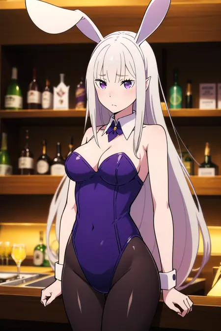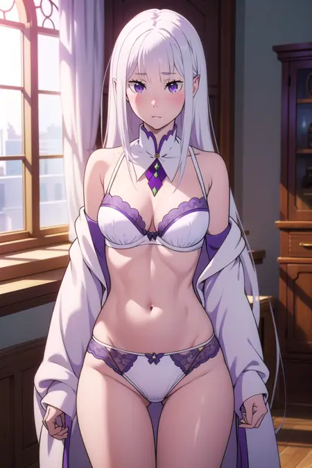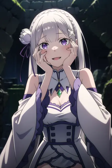 Default outfit: hair flower, x hair ornament, hair ribbon, white dress, detached collar, wide sleeves, white thighighs,