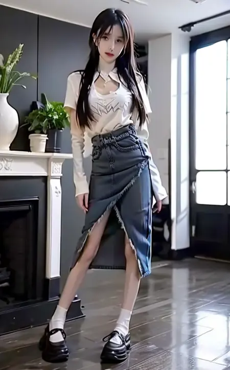 세트는 하얀 베이지 미디어 블라우스, 흰색 소매 카프레트, 슬릿이 있는 데님 긴치마, 흰색 양말, 일본식 둥근 앞발의 마리제인 샌들로 구성됩니다.