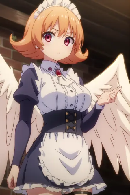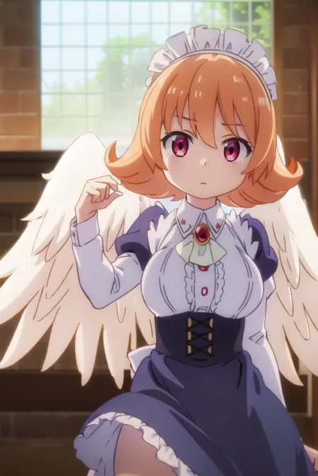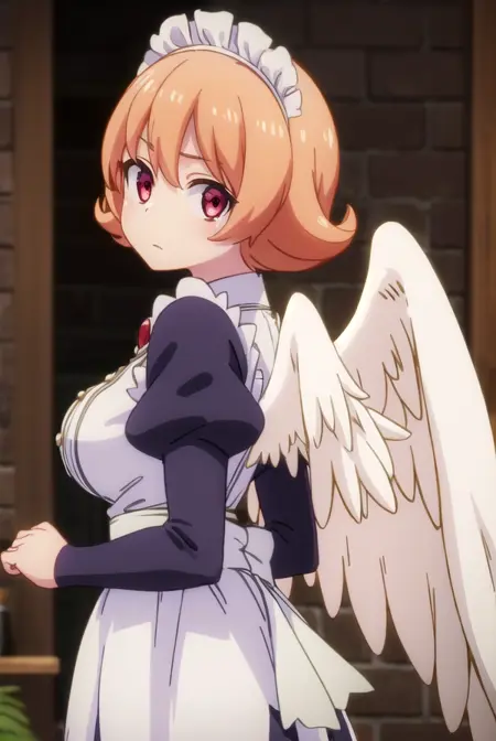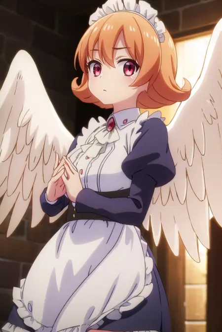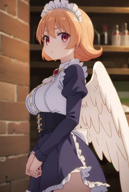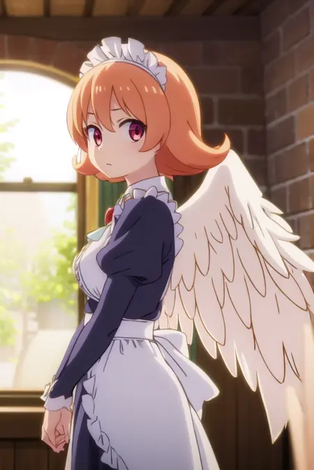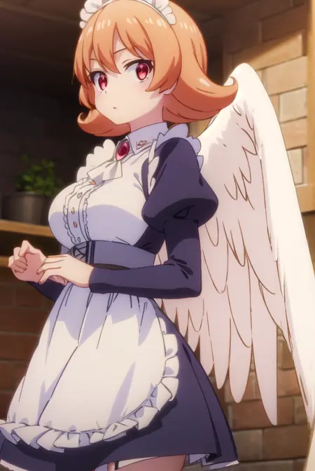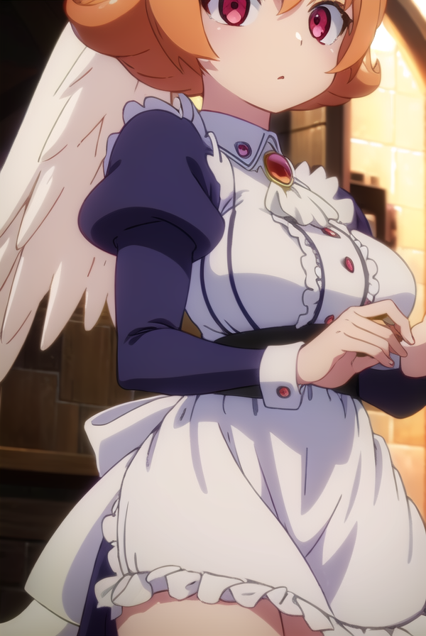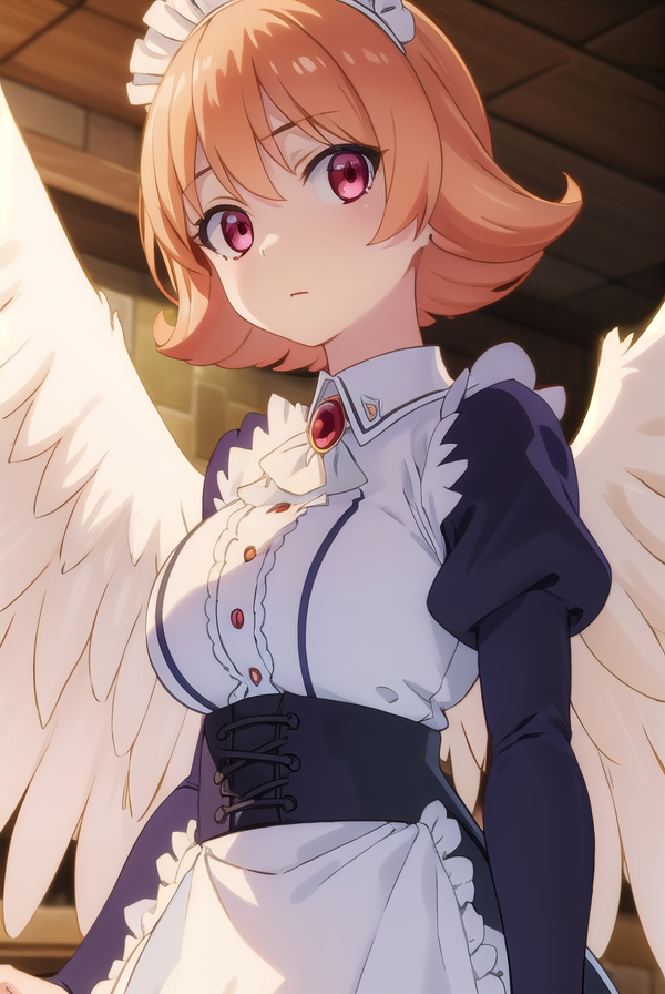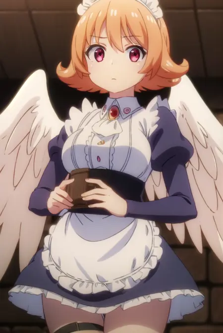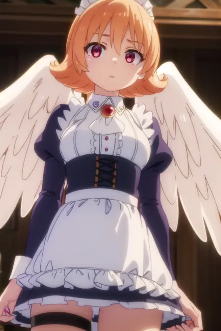 long sleeves, dress, jewelry, frills, wings, puffy sleeves, apron, maid, maid headdress, thigh strap, juliet sleeves, brooch, white apron, feathered wings, maid apron, puffy long sleeves, white wings,