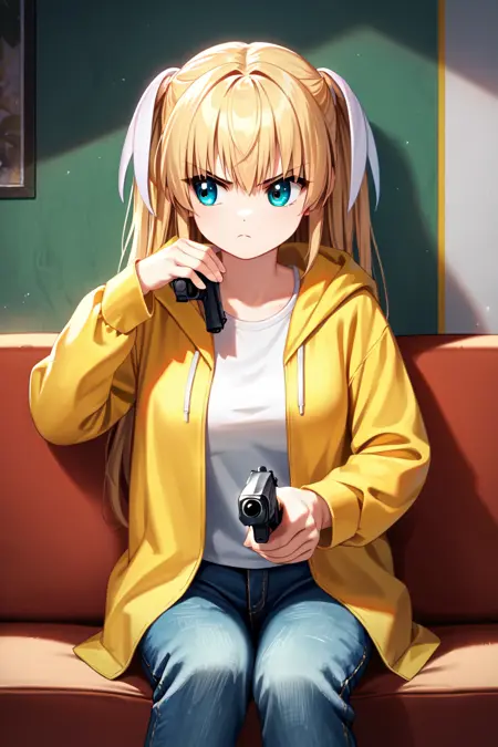 black uniform with red trim and pink bow, pleated grey plaid skirt, two side up,