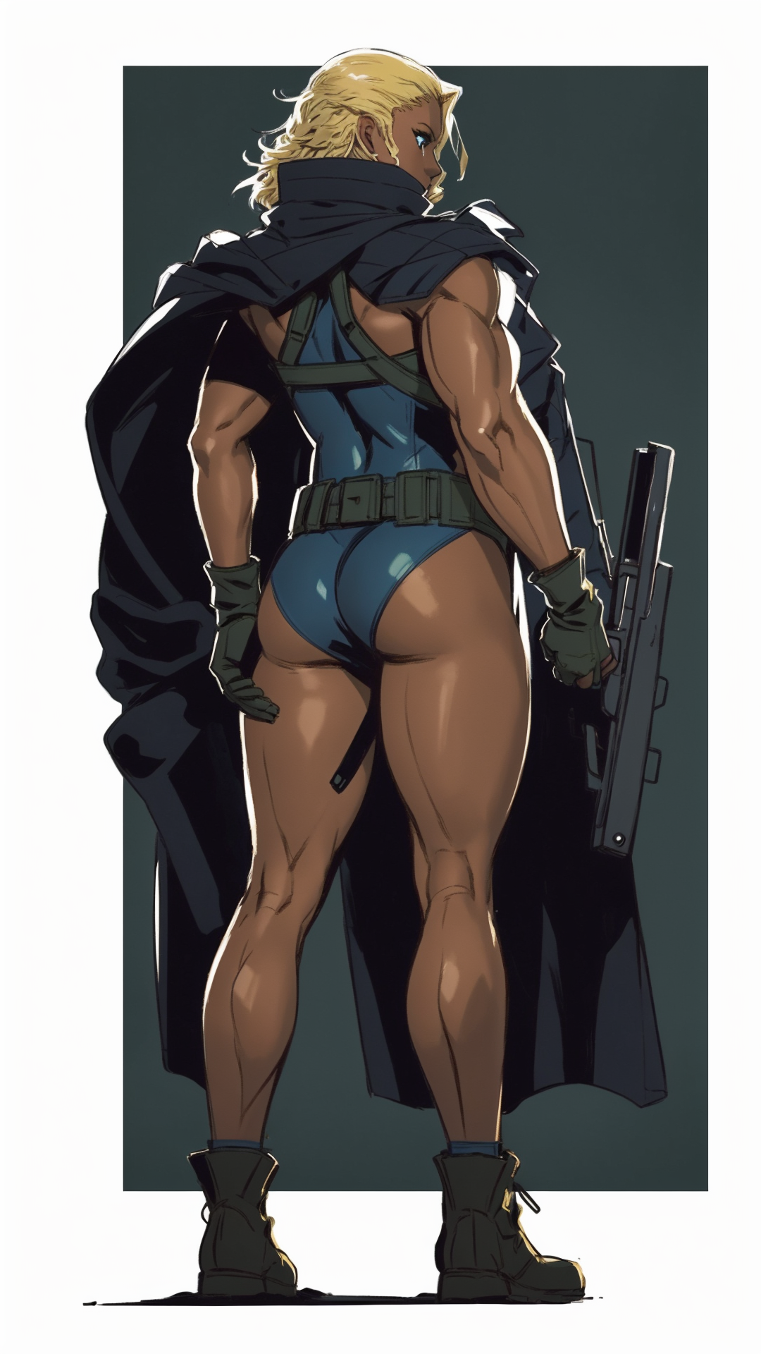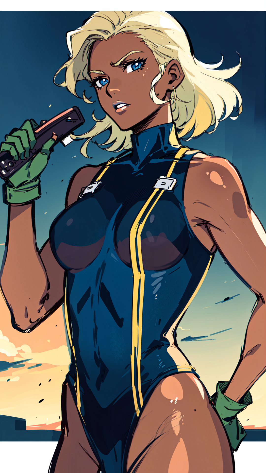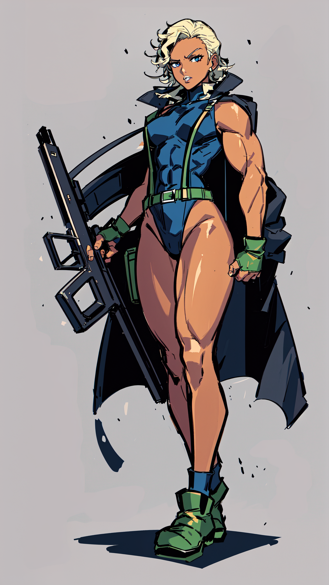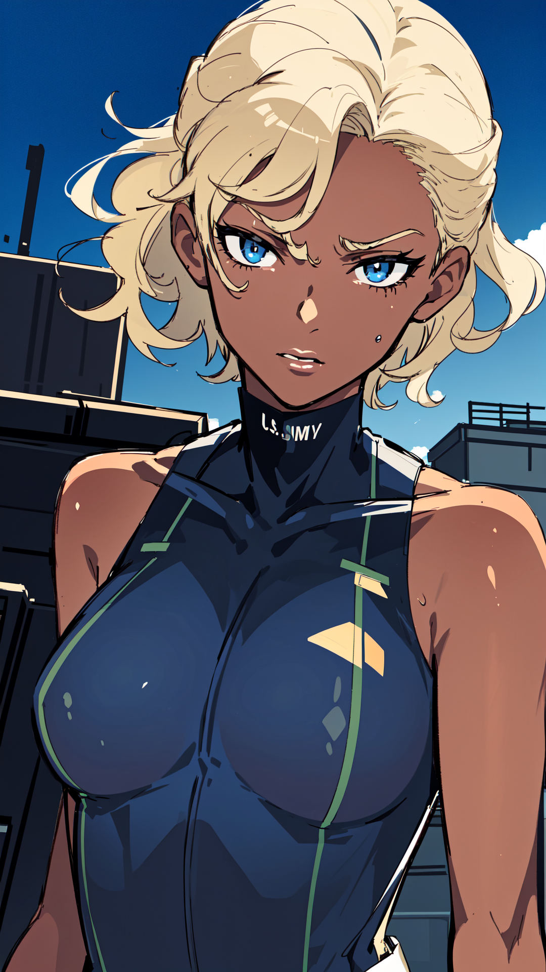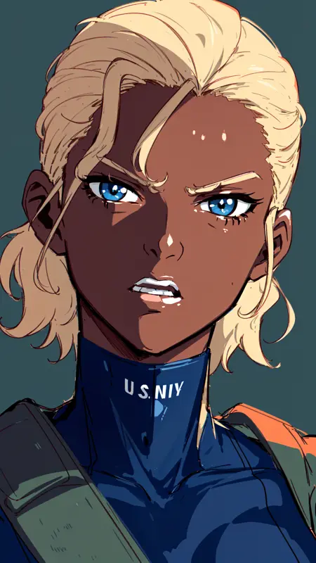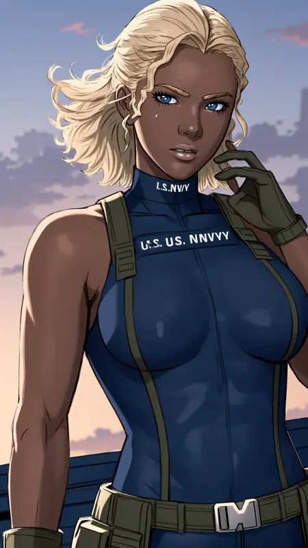 1woman, dark skin, blonde hair, blue eyes, light lipstick, dark blue skintight tank outfit, green coat, military, text "U.S. Navy" on outfit, fingerless gloves, small boots,