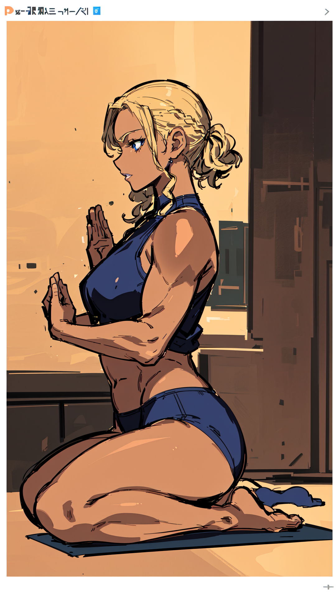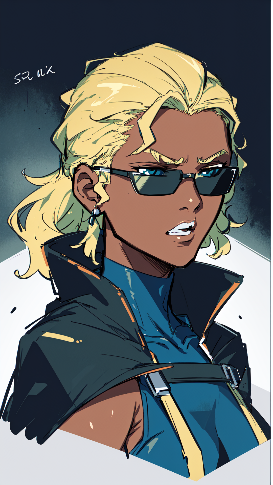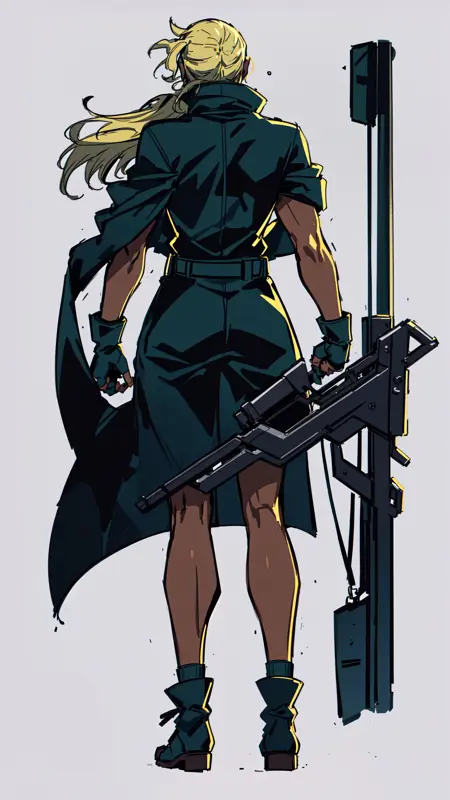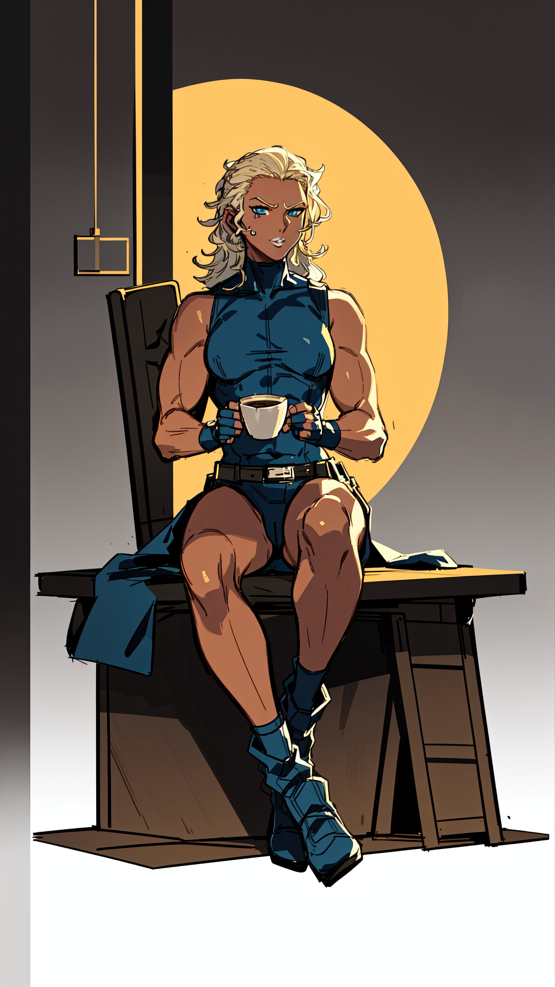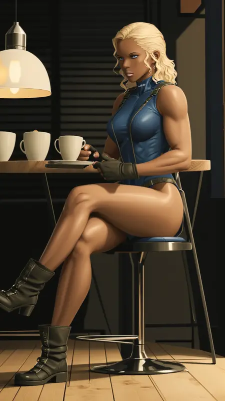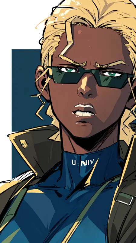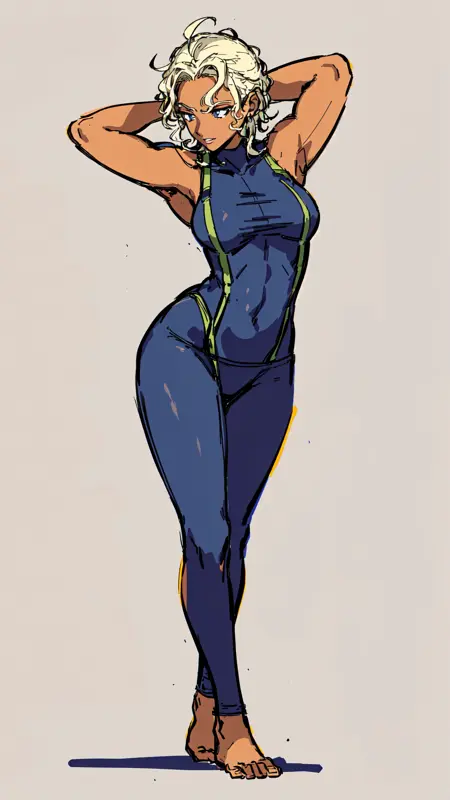 1woman, dark skin, blonde hair, blue eyes, light lipstick, dark blue skintight tank outfit, green coat, military, text "U.S. Navy" on outfit, fingerless gloves, small boots,