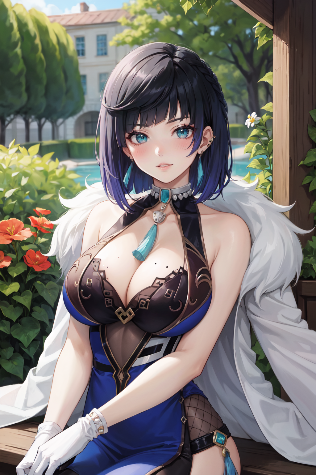 yelan, short hair, large breasts, jewelry, diagonal bangs, bob cut, cleavage, gloves, mole, black hair, fur trim, bare shoulders, earrings, jacket, mole on breast, white jacket, elbow gloves, dress