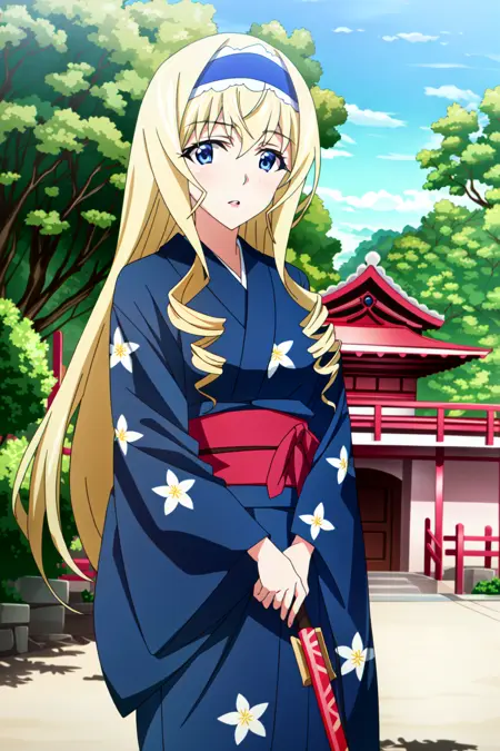 Cecilia Alcott, japanese clothes, blonde hair, 1girl, blue eyes, kimono, long hair, hairband, solo, smile, blue hairband, yukata, drill hair, blue kimono