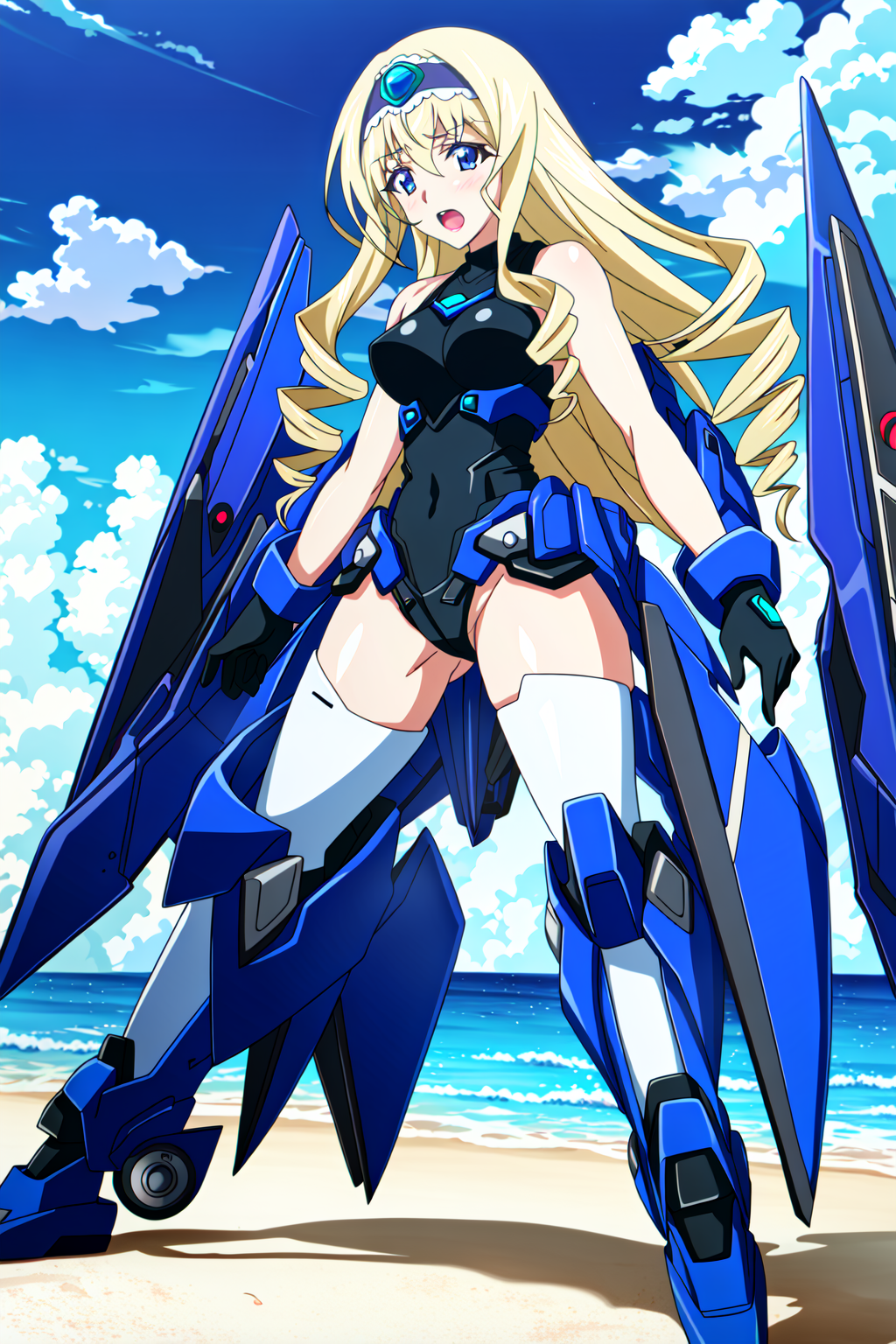 Cecilia Alcott, 1girl, solo, blonde hair, leotard, mecha musume, long hair, pilot suit, blue leotard, drill hair, hairband