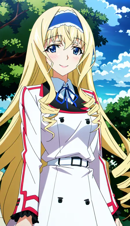 Cecilia Alcott, 1girl, solo, long hair, blonde hair, blue eyes, school uniform, drill hair, hairband, blue hairband, smile