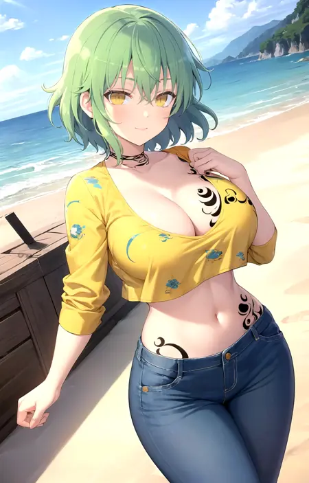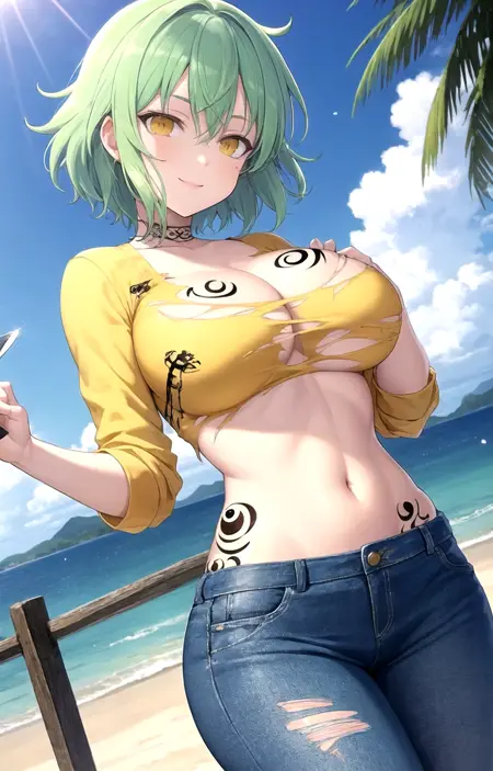 Main outfit: blue pants, denim pants, yellow shirt, crop top, and midriff.