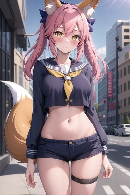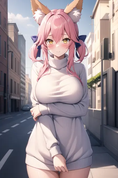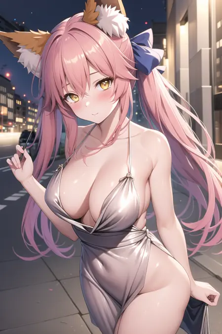 appearance: tamamonm, pink hair, hair between eyes, sidelocks, short twintails, yellow eyes, animal ears, fox ears, fox tail, blue bow, large bow, hair bow, large breasts,