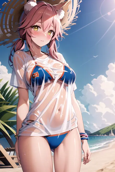 bikini: blue bikini, white shirt, wet shirt, straw hat, bracelet, bikini under clothes, t-shirt, see-through,