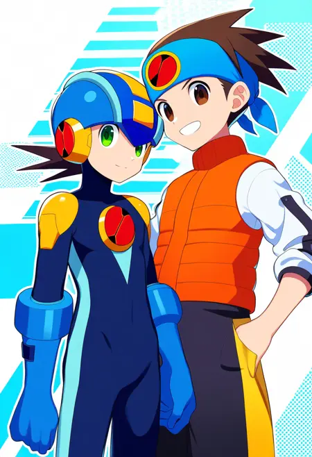 An experimental LoRA intended to generate both Lan Hikari AND Megaman.exe in the same image. Trained on 100 images created in NAI, 20 images of Lan, 20 images of Megaman and the remaining 60 on both characters together.