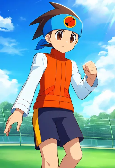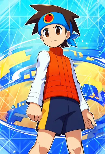 Triggers: 2boys, lan hikari, orange vest, long sleeved white shirt, black shorts, megaman.exe, blue bodysuit, blue gloves, helmet, blue boots