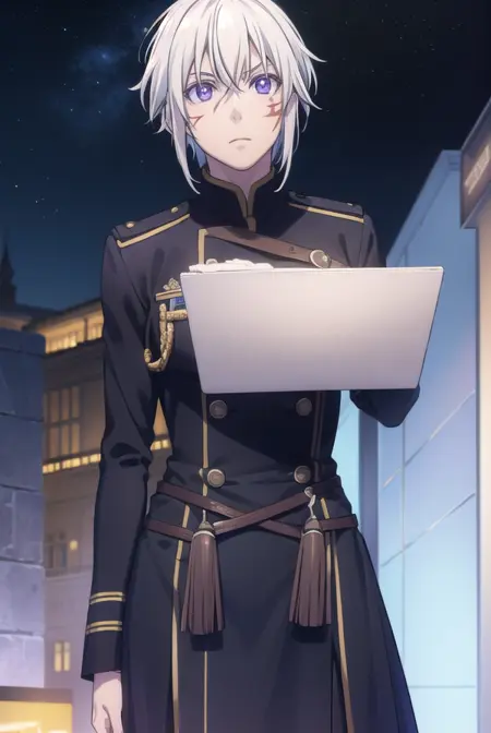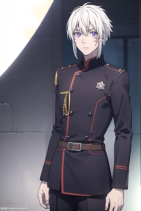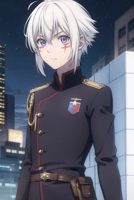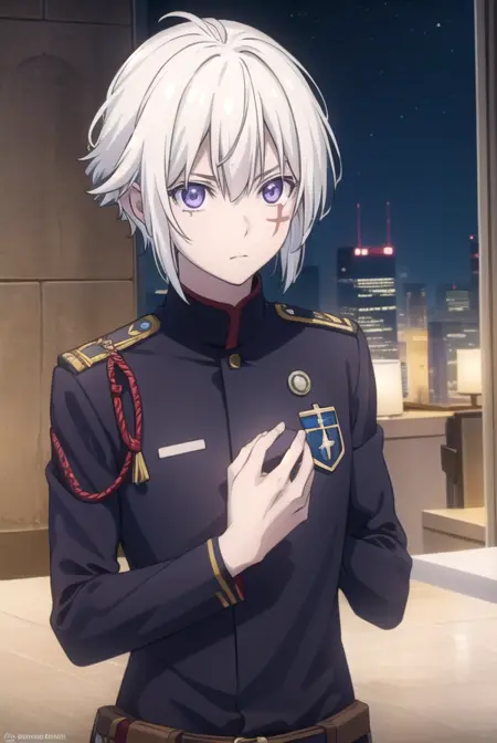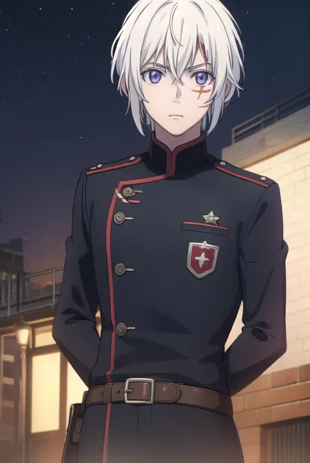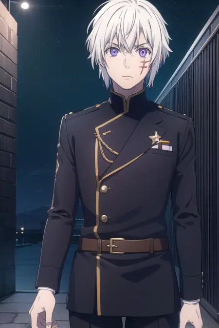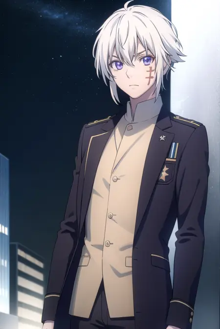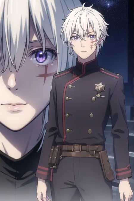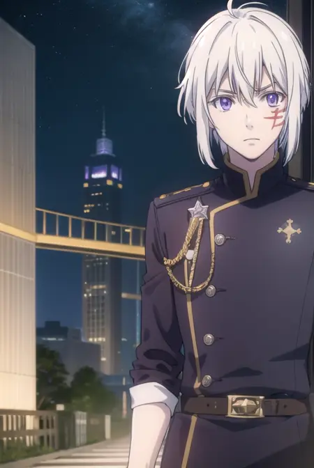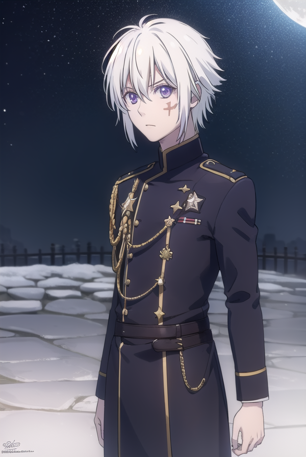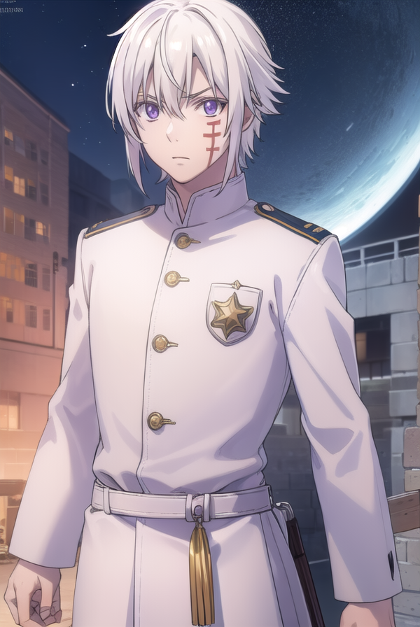 allen walker, (purple eyes:1.1), white hair, male focus, scar, facial mark,