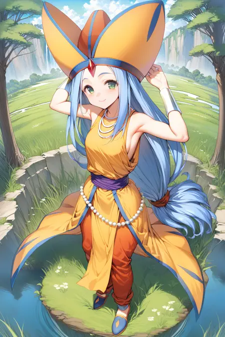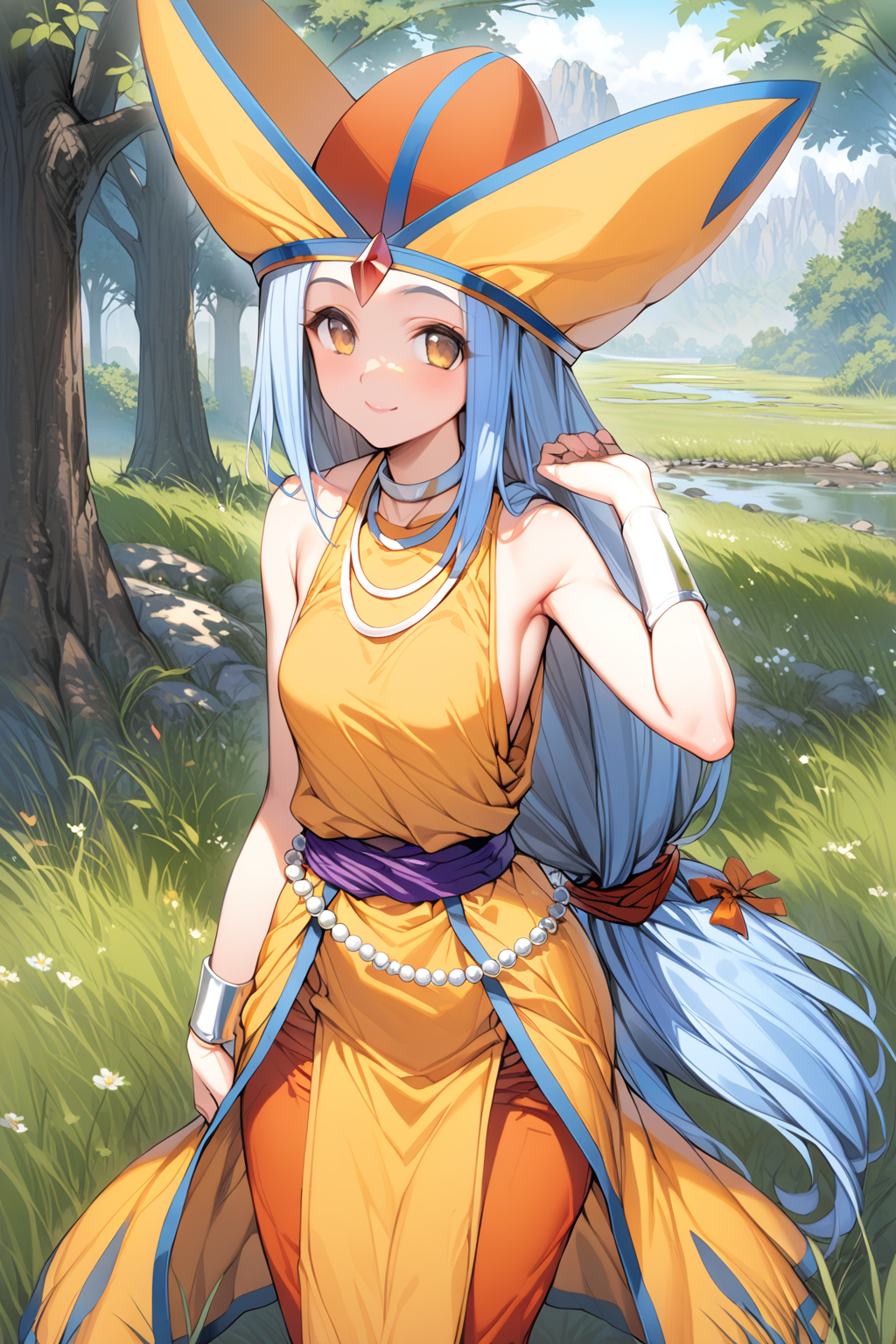 Add "hat,necklace,wristband,dress,pelvic curtain,pants,jewelry,prayer beads,footwear,low-tied long hair" for her typical look.(AnimagineXL-v1.0,PonyXL-v1.0)