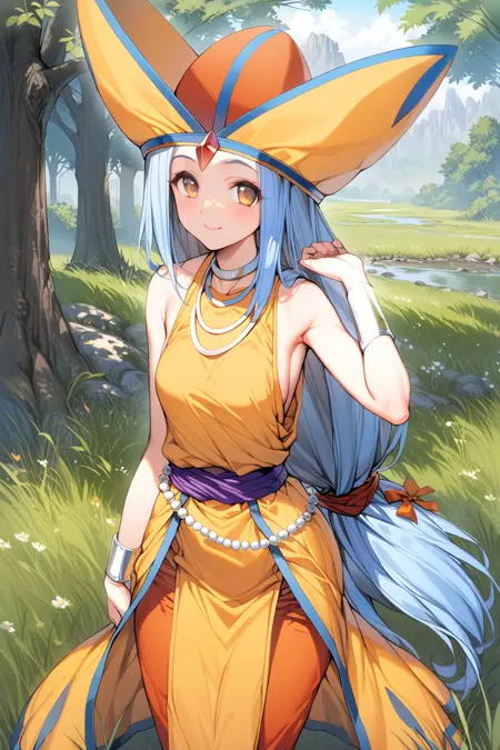 为表现她典型的造型,添加“帽子、项链、手环、连衣裙、骨盆帘、长裤、珠宝、念珠、鞋履、低绑长发”。(AnimagineXL-v1.0、PonyXL-v1.0)