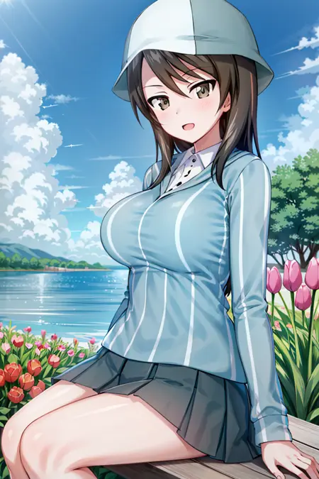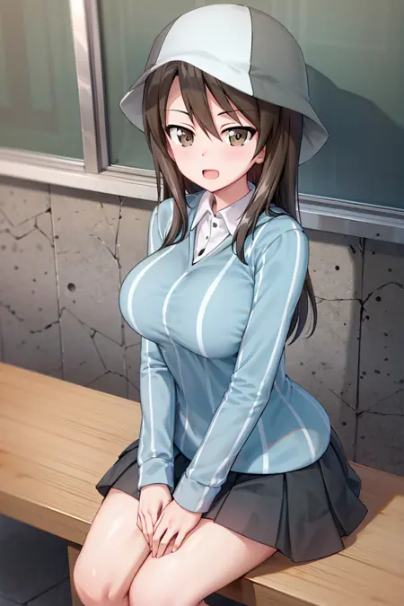 미카 메인 의류 태그: 파란색 머리 장식, 튤립 모자, 큰 가슴, 경속 학교 운동복, 세로줄 셔츠, 날개 달린 칼라, 흰색 셔츠, 파란색 셔츠, 긴팔, 회색 치마