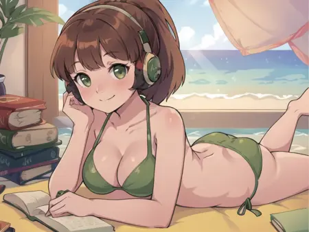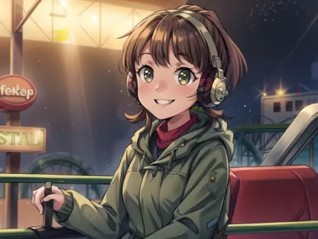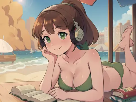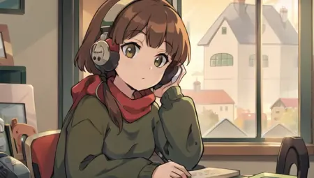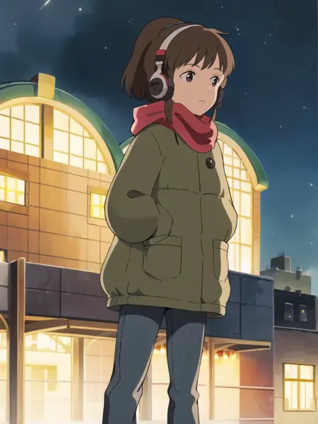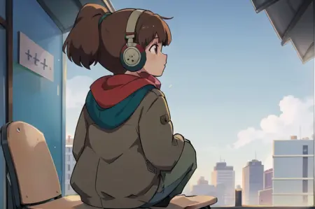 lora:LofiGirlv2:.8, 1girl, solo, brown_hair,ponytail,headphones,green sweater,blue pants,red scarf
