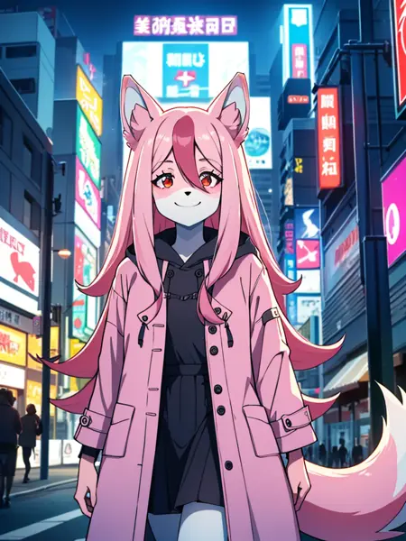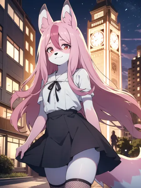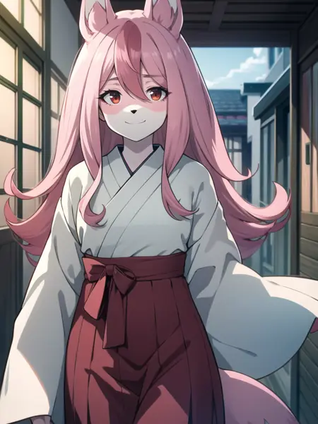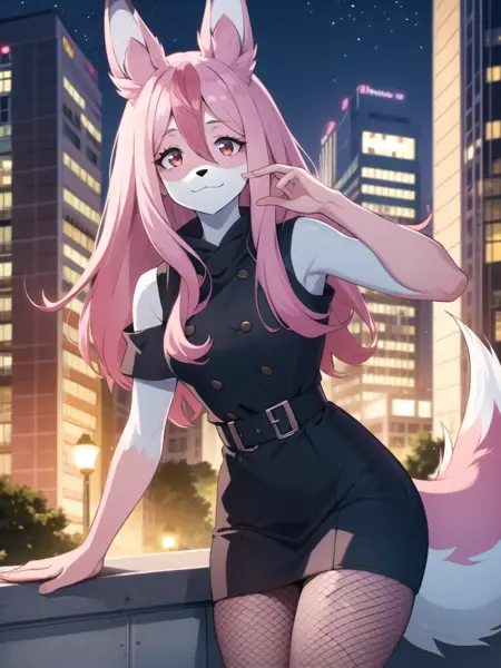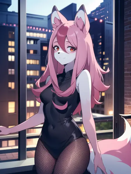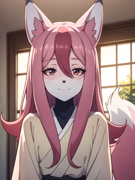 1 girl,solo, furry,fox girl,furry female, animal ears, nazuna_hiwatashi, pink hair,long hair, red eyes, hair between eyes, white skin,(two tone skin, pink colored limbs), animal nose, triangle shaped nose, (tail), [bushy tail:0.7], (high quality, best quality, (4k), hi res, masterpiece, beautiful, high details)