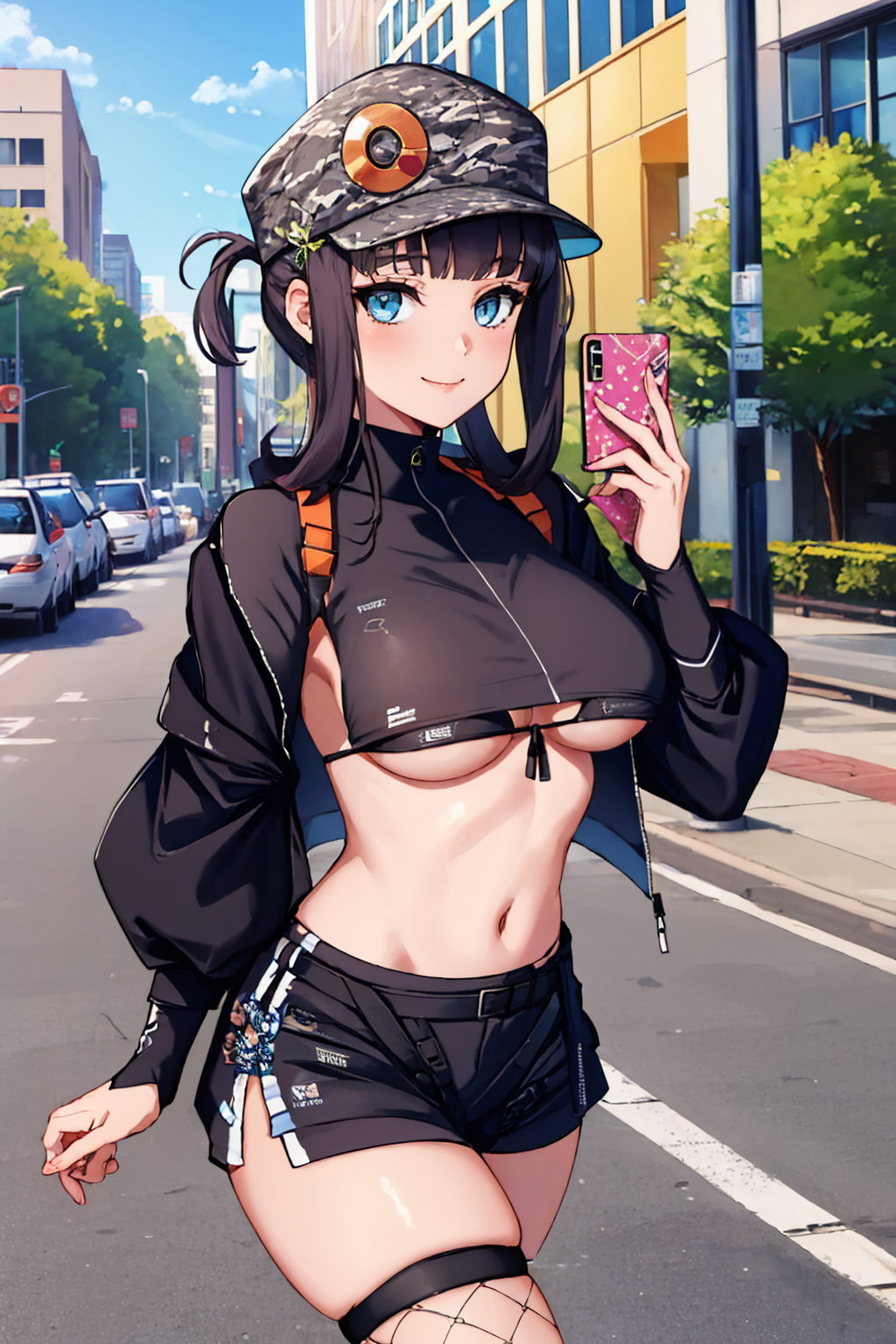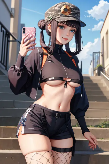 Heroic Spirit: yangheroic, baseball cap, jacket, open jacket, long sleeves, crop top, underboob, black shorts, single thighhigh, fishnet thighhighs