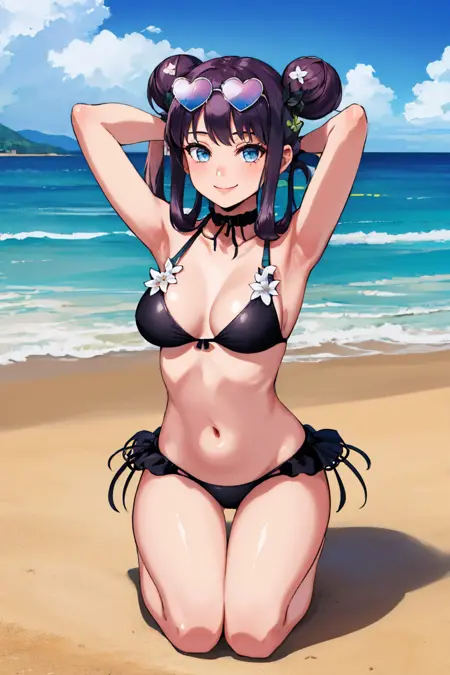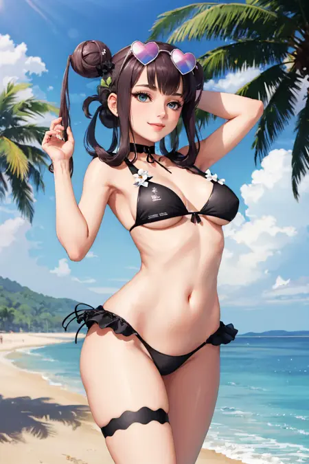 Honey Lake: yangswim, double bun, twintails, hair ornament, eyewear on head, heart-shaped eyewear, black bikini, choker