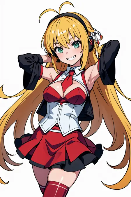 JamBAND 복장: makijam, antenna hair, hair beads, headphones, white vest, red necktie, detached sleeves, skirt, single thighhigh, red thighhighs, bare shoulders, cleavage
