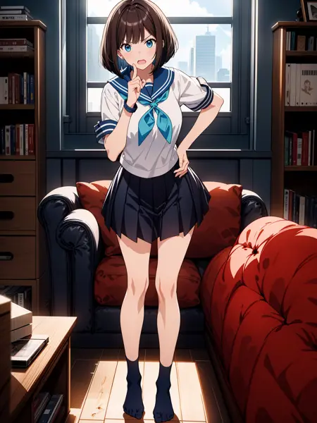 右の人差し指を上げて前に傾くポーズ。何かを強調しているか、叱っている様子。