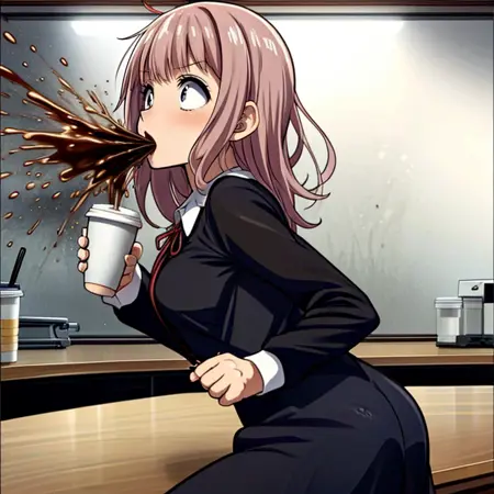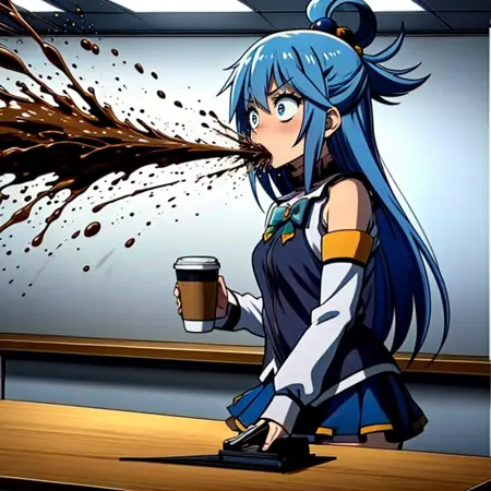 I've LoRa-ized the scene where someone, acting cool and composed, listens to a story and ends up spitting out the drink they were sipping in surprise. In trying to depict the action of spitting out a liquid with Stable Diffusion, it seems challenging to accurately represent the liquid coming out of the mouth. After testing, a strength setting of 0.6 appears to be the most effective.