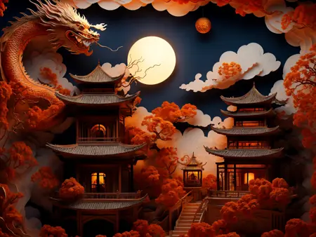 提示词:eastern dragon, dragon, no humans, building, moon等。