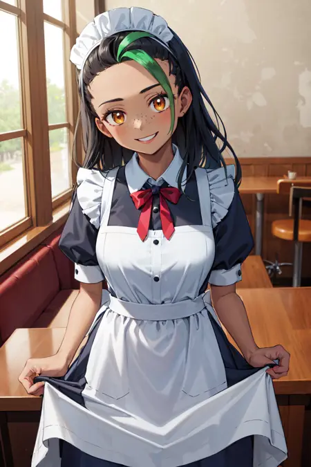 - aanemona,深色皮肤女性,深色皮肤,睫毛,雀斑,长发,多色头发,条纹发,马尾,头发扎起,校服,(紫色领带:1.2),衬衫,有领衬衫,(白色衬衫:1.1),短袖,短裤,(紫色短裤:1.4),连裤袜,黑色连裤袜,鞋子