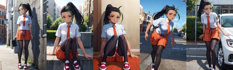 - aanemona,深色皮肤女性,深色皮肤,睫毛,雀斑,长发,多色头发,条纹发,马尾,头发扎起,校服,(橙色领带:1.2),衬衫,有领衬衫,短袖,(白色衬衫:1.1),短裤,(橙色短裤:1.4),连裤袜,黑色连裤袜,鞋子
