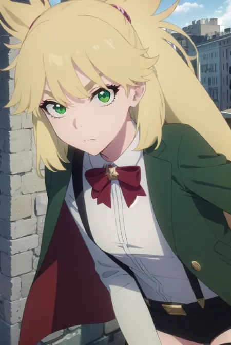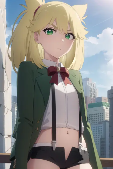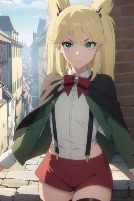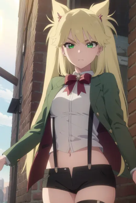 shirt, thighhighs, long sleeves, bow, jacket, white shirt, shorts, bowtie, red bow, thigh strap, capelet, black shorts, suspenders, green jacket, suspender shorts,
