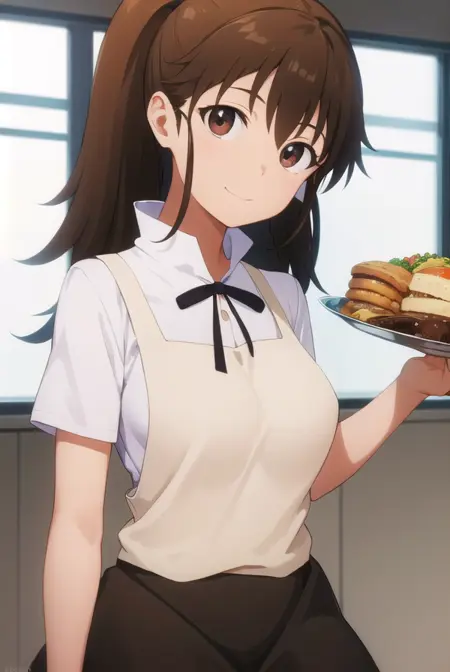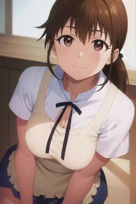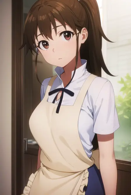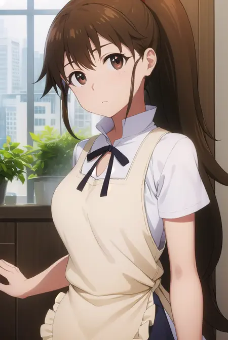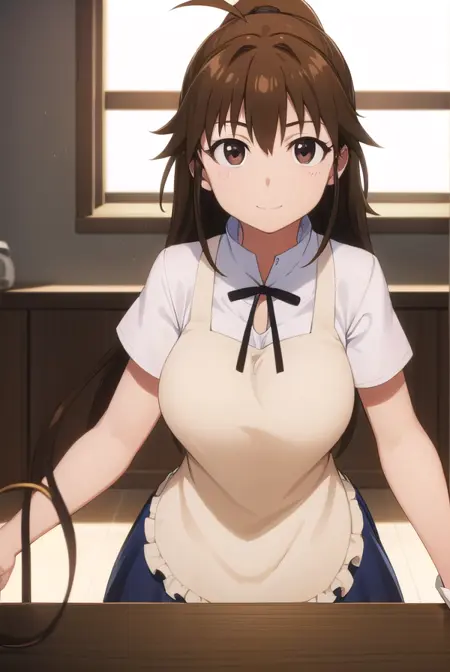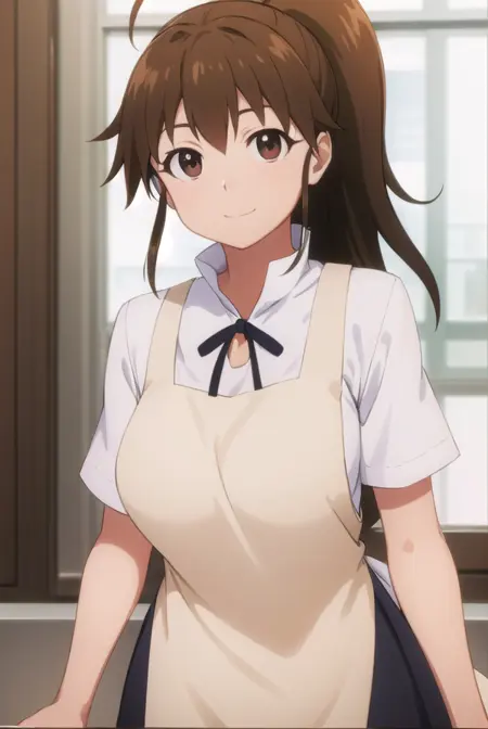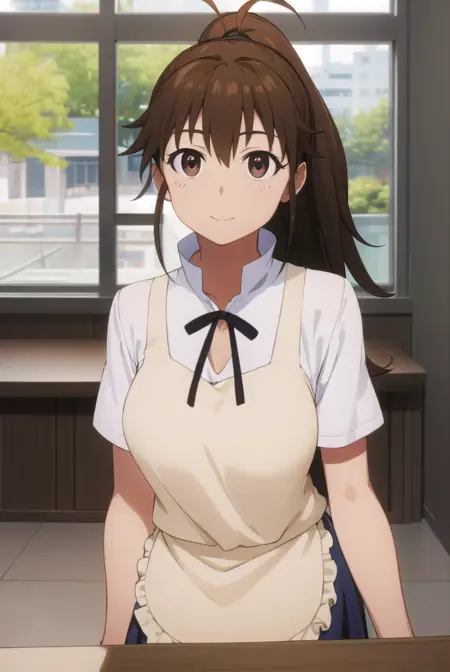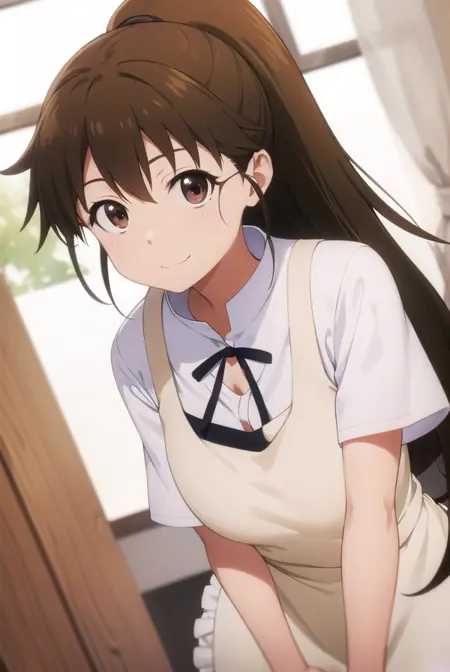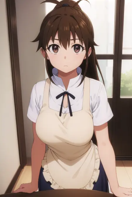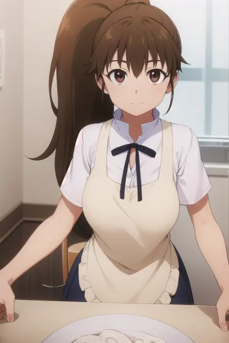 popura taneshima, long hair, brown hair, (brown eyes:1.5), ponytail, ahoge,