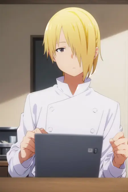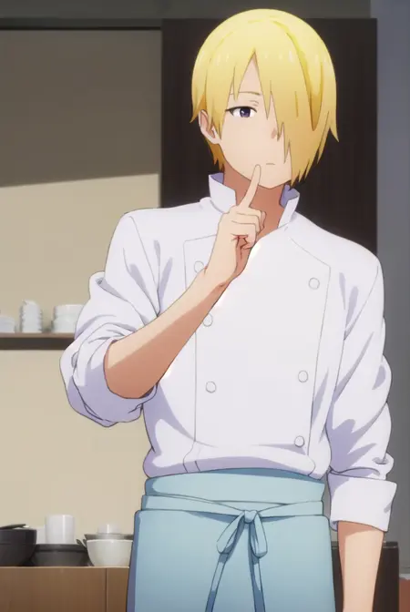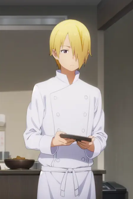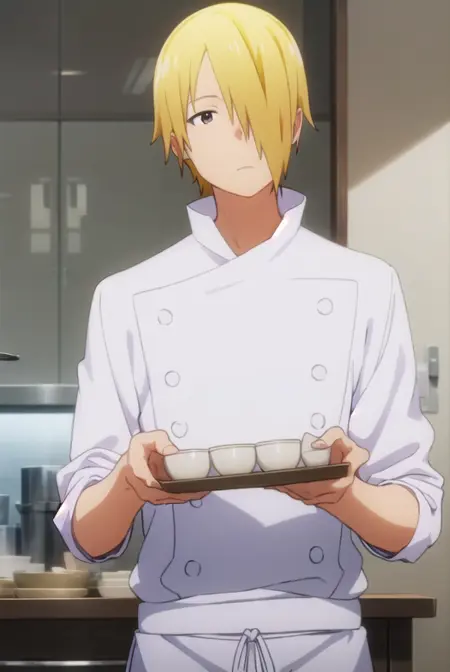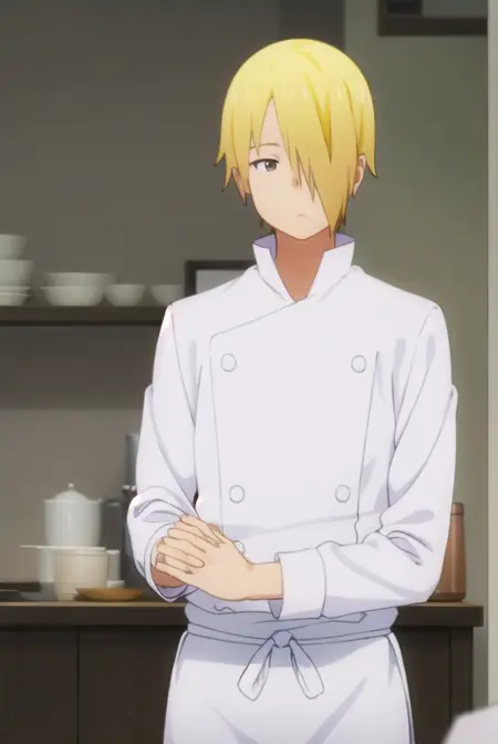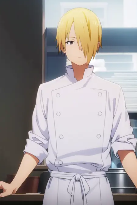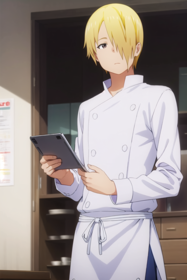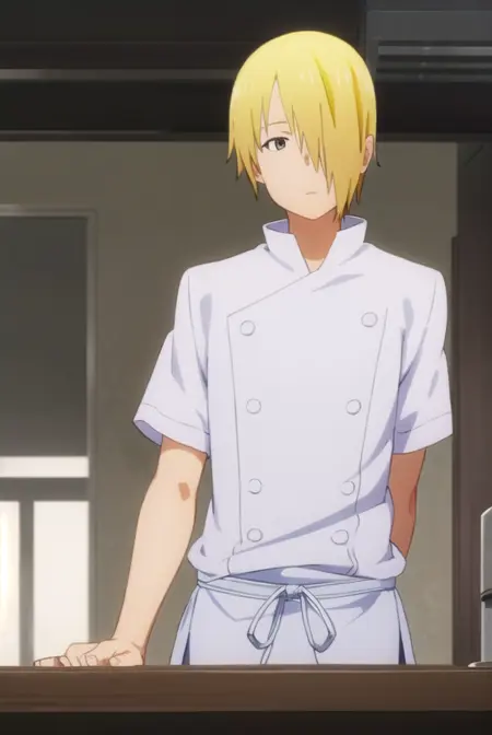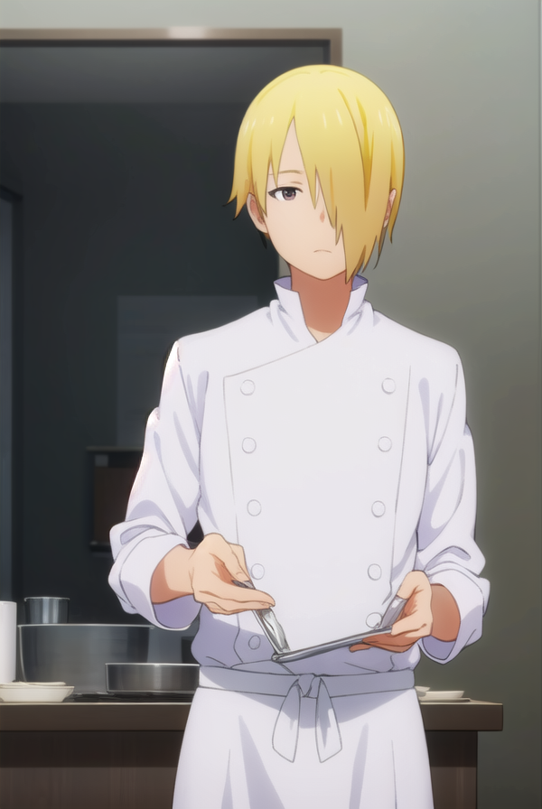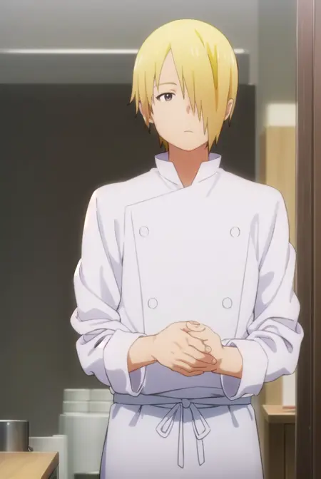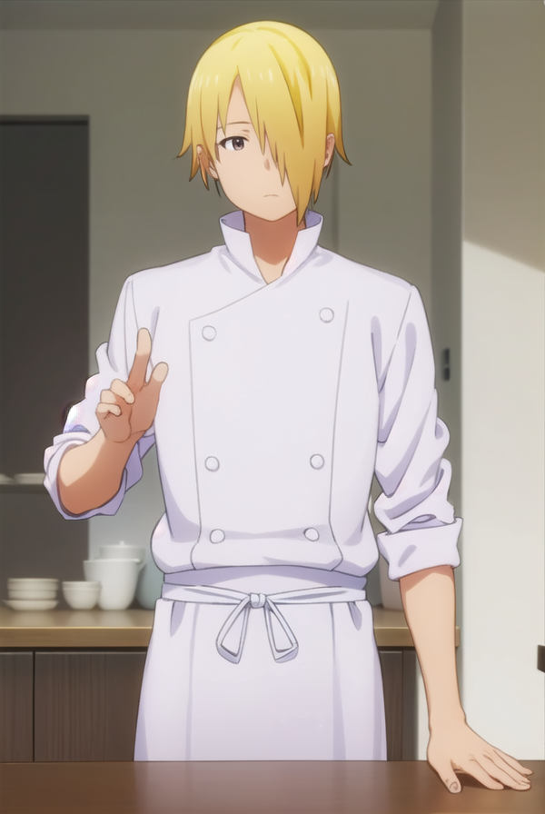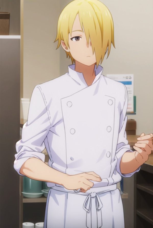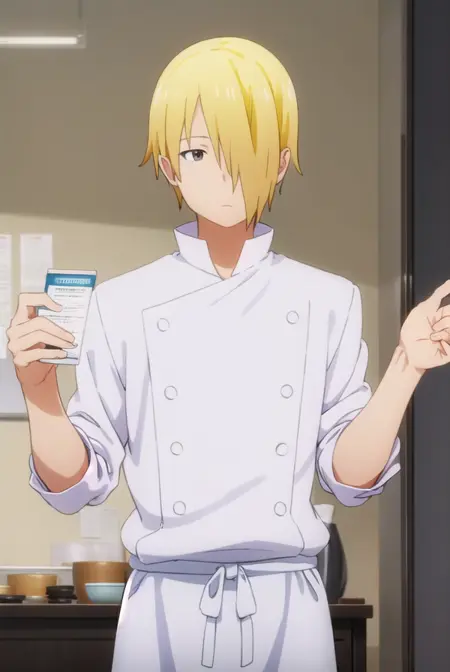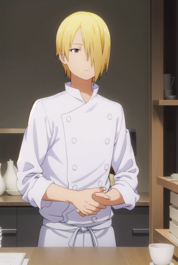 jun satou, blonde hair, male focus, (hair over one eye:1.5), (brown eyes:1.3),