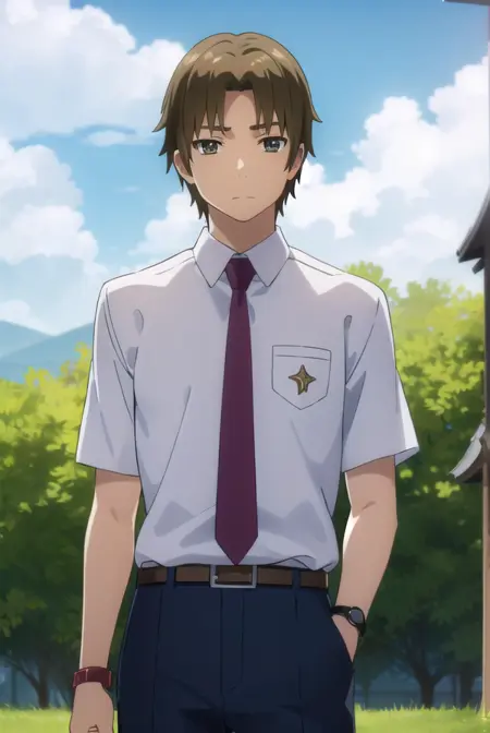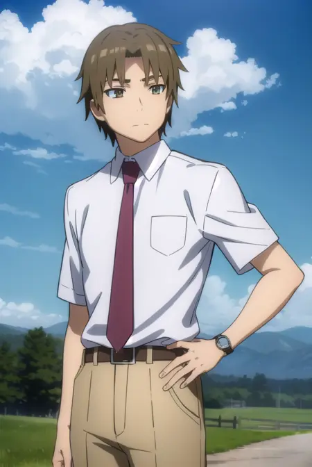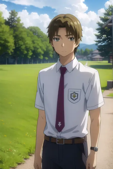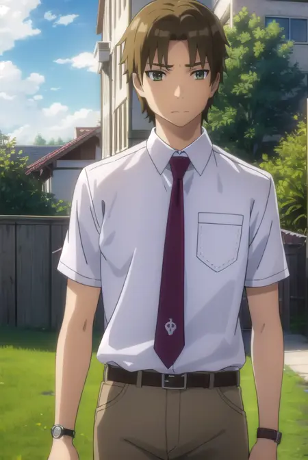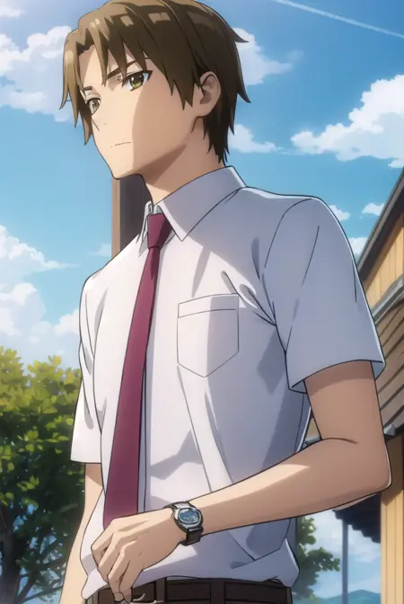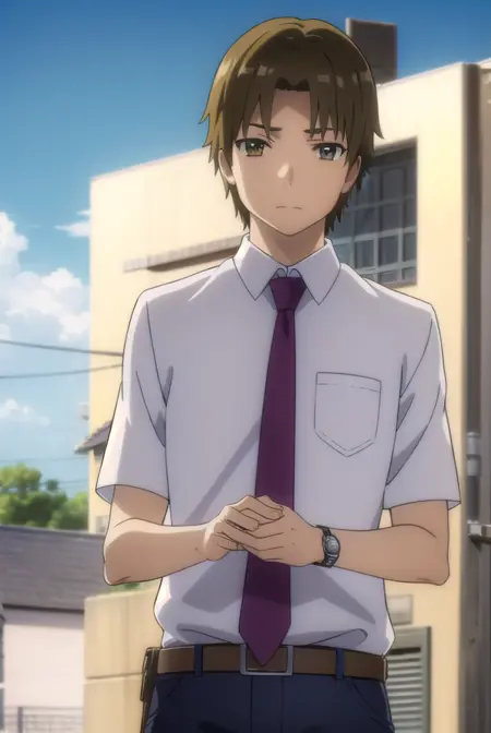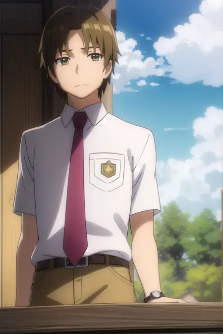 shirt, school uniform, white shirt, short sleeves, necktie, collared shirt, belt, pants, red necktie, watch, wristwatch,