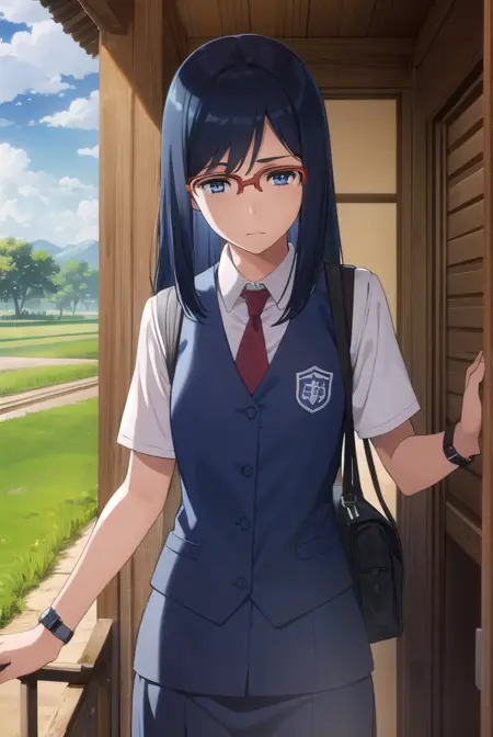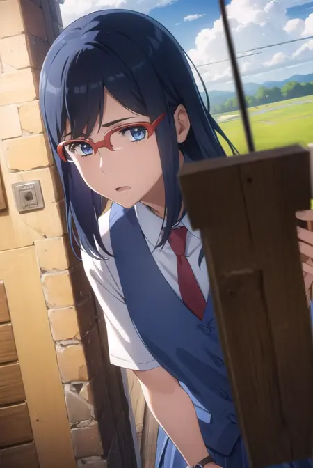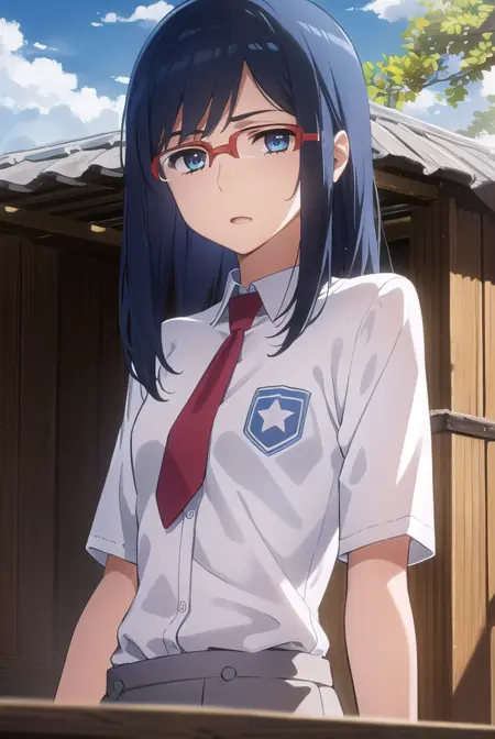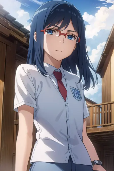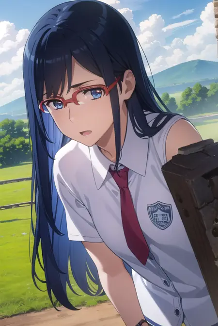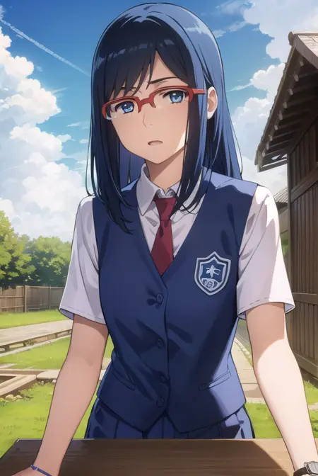 chiriko tsurumi, 长发, 蓝眼睛, 蓝发, 眼镜, 红框眼镜,
