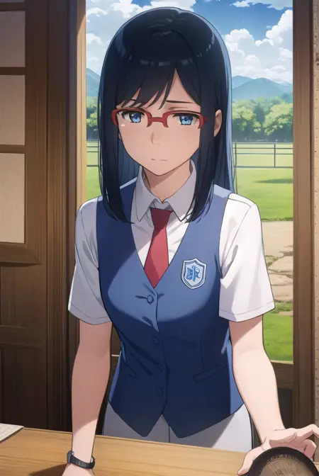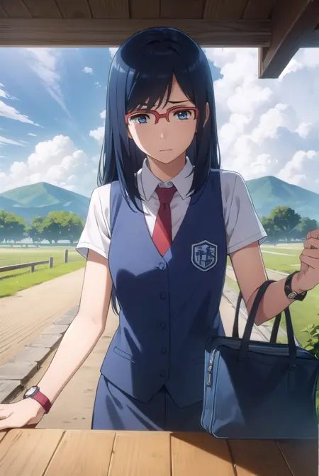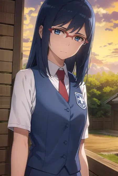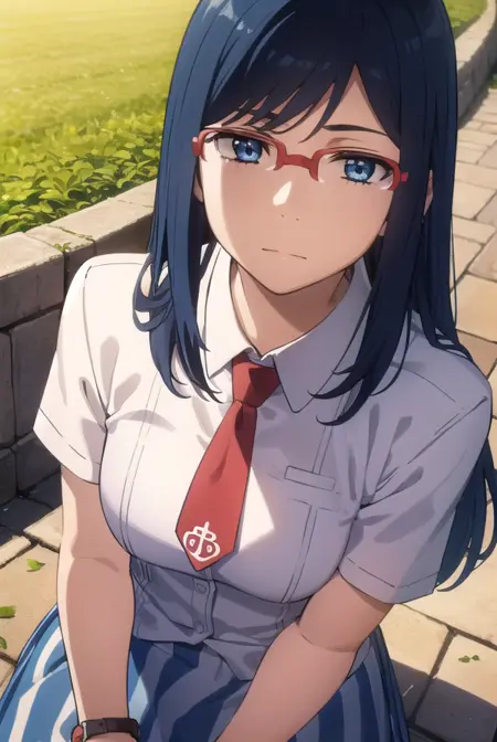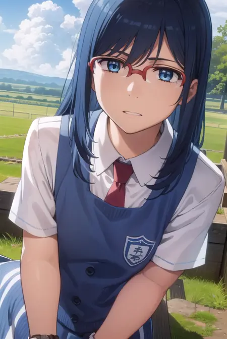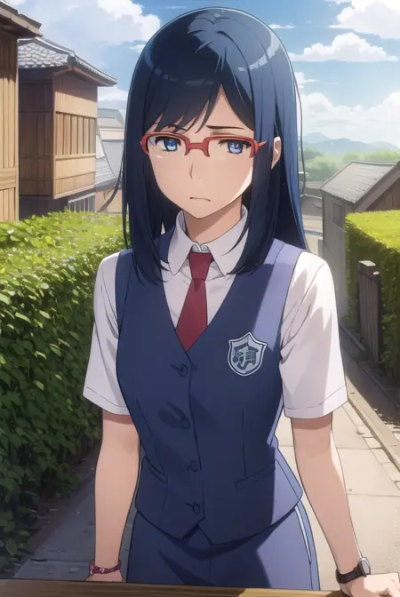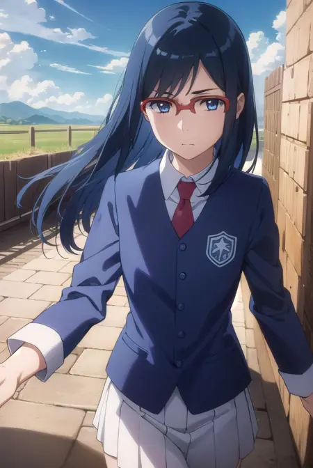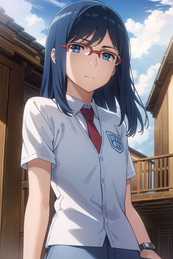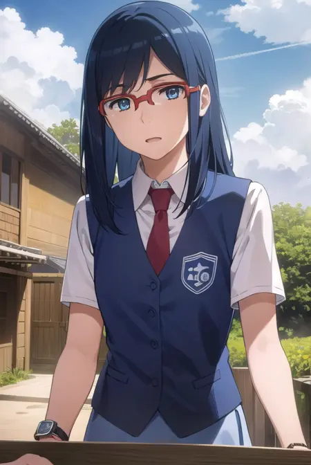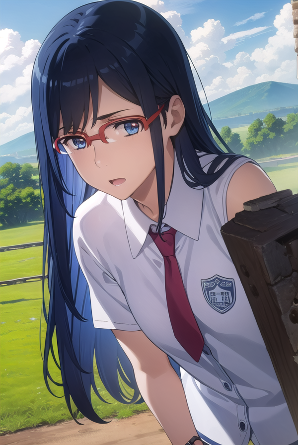 chiriko tsurumi, long hair, blue eyes, blue hair, glasses, red-framed eyewear,